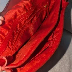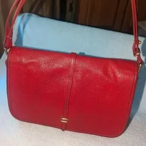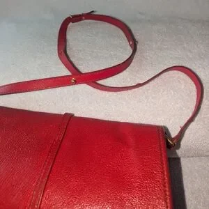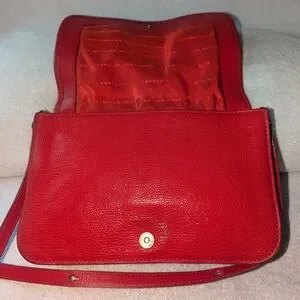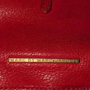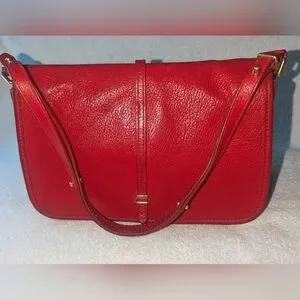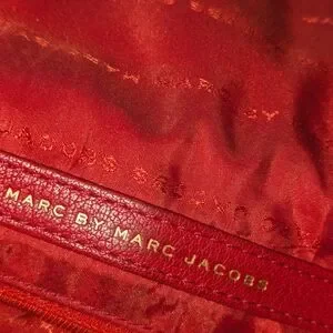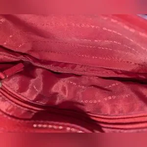 Beautiful red leather with adjustable strap shoulder messenger bag by Marc by Marc Jacobs. Flap magnetic closure. Two interior compartments One zip pocket and two slip pockets inside. Bag is in good pre-owned vintage condition. Some discoloration on lining as shown in the picture. 19"-7"-2.5"