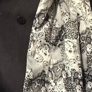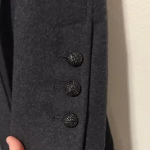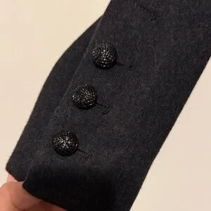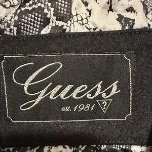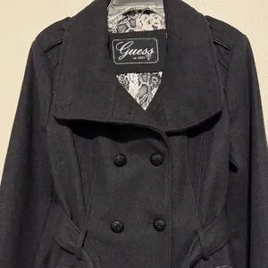 Stylish GUESS trench coat in solid black. Double-breasted front with matching buttons. Self-tie belt for a defined waist. Notched lapel and long sleeves. Clean, versatile piece for everyday wear. Excellent used condition.