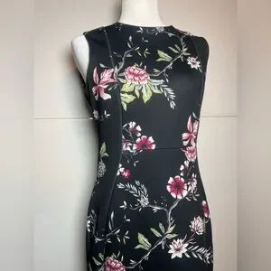 Elegant floral sheath dress by Calvin Klein in size 6. Features a flattering sleeveless silhouette with a classic fitted sheath shape and beautiful pink floral print on a black background. Stretch fabric provides a comfortable fit while keeping a polished, tailored look.
