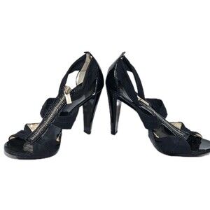 Keywords: Michael Kors, MK, Berkley T-Strap, Black Patent Leather, Size 10M, Womens Heels, Zip Front, Open Toe, Strappy Sandals, Stiletto, High Heel, Platform, Designer, Formal, Party, Evening, Cage Sandal, Peep Toe, Glossy