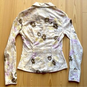 Keywords: Guess shirt, floral western blouse, Y2K Guess top, pastel floral snap shirt, boho cowgirl style, lace detail button-up, fitted cotton blouse, juniors sizing