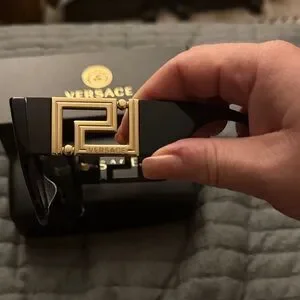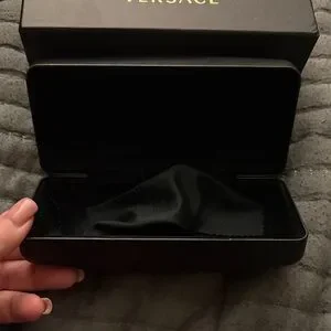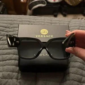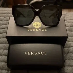 Bold square silhouette from Versace. Polished black acetate frame. Dark lenses provide classic, polished look. Distinctive designer branding detail. Sleek and versatile for everyday wear.