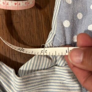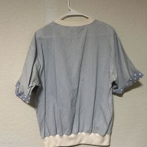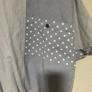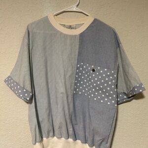 This unique top is a vintage 90s Holiday Beach Club short-sleeve shirt. It features a distinctive mixed-media patchwork design, combining light blue vertical stripes on the right side with a solid blue panel on the left, further accented by a large polka dot chest pocket.