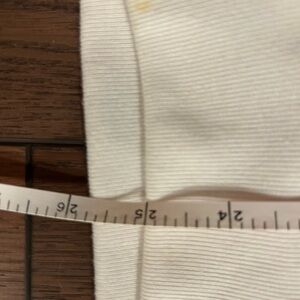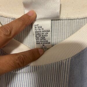 The shirt has a relaxed, oversized fit with a white ribbed crew neckline and a wide elasticized hem, which can be tucked under for a cropped look.