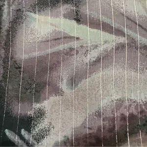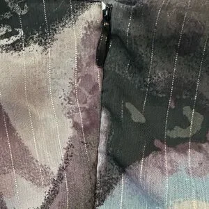 A Byer sleeveless blouse with ruffle front detail, tie back neckline, and abstract print. Lightweight lined fabric.