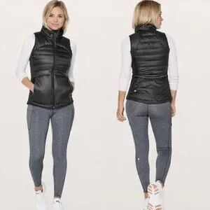Lightweight Lululemon Down For A Run Vest in classic black designed for cold-weather running and training. Features 90% goose down insulation, stretchy performance side panels for mobility, reflective trim, zip pockets, and a high funnel collar for warmth. Ideal for running, hiking, travel, and athleisure layering.