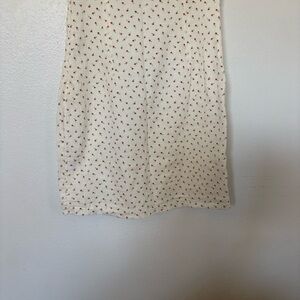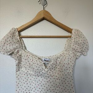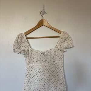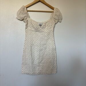 A white mini dress with delicate floral print. Features short puff sleeves and a tie-front neckline for a flattering fit. Lightweight and feminine, perfect for daytime events and warm-weather outings.