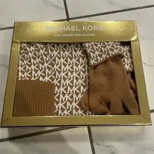 Elegant Michael Kors set with tan and white design. Perfect for stylish warmth.
