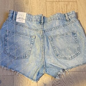 Stylish blue jean shorts by Zara. Features diamond pattern and frayed edges. Perfect for casual wear.