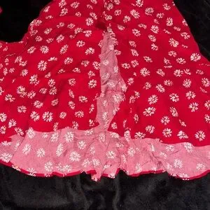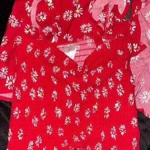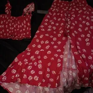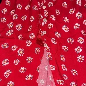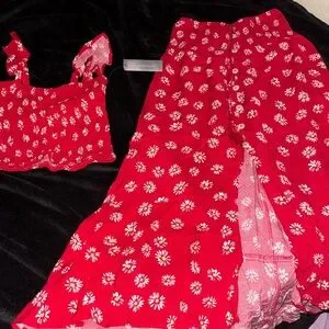 Lightweight two-piece set with a cropped smocked top and matching flowy skirt. Features all-over white daisy print with yellow centers. Button-front detail on the skirt. Feminine and casual look.