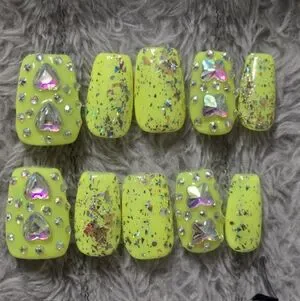 Bright neon yellow press-on nails with multicolored glitter flakes. Accented with iridescent rhinestones and heart gems. High-shine, eye-catching set ready to wear.