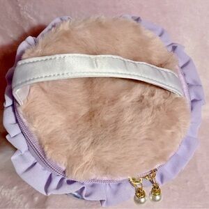 This adorable bag is round, floral lavender vanity pouch bag. Zippered top with two faux pearl zipper pulls and ruched trim around.
