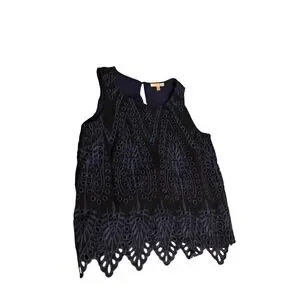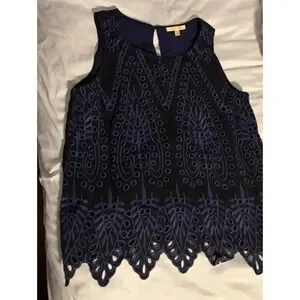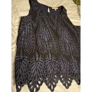 Skies Are Blue Black Navy Eyelet Embroidered Sleeveless Top Scalloped Hem M