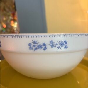 vintage milk glass bowl featuring a blue floral design, identified as the "Blue Roses" pattern made by Federal Glass