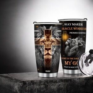 This stylish tumbler features a striking lion design with a cross, perfect for your daily beverages. The black and gold colors add a touch of elegance. Ideal for home dining or on-the-go use.