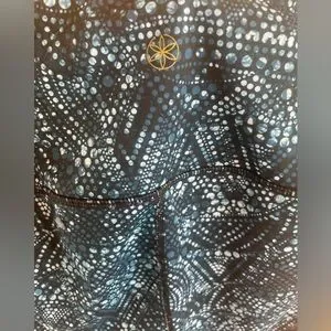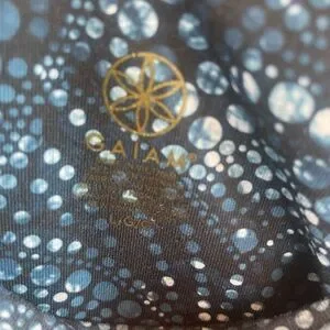 Gaiam high-waisted athletic leggings in a navy and white geometric digital print. Excellent like-new condition with no pilling, stains, or signs of wear. Heavyweight performance fabric with significant stretch and a compression fit. Best for yoga, pilates, or gym wear.