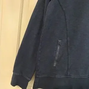 Simple navy crewneck pullover from Orvis. Soft-feel fabric with subtle seam detailing. Twin zippered front pockets for secure storage. Ribbed cuffs and hem for a clean finish.