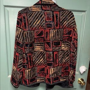 Make a bold statement with this chic abstract blazer. Featuring a striking combination of red, black, and tan, it's perfect for adding flair to any outfit. reversible I believe it to be a women’s size XL. It doesn’t have any tags in it any longer. They were taken out, but it was only worn in a few times.
