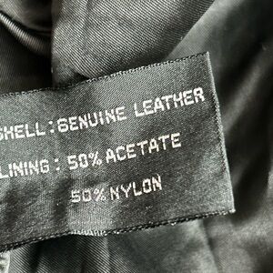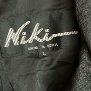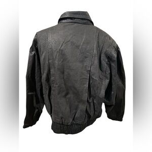 Classic black bomber with textured finish and a high stand collar. Lightweight structured body for easy layering. Button-front placket and elasticized hem for a secure fit. Sleek black color works for casual and refined looks. In good used condition. Measurements are 29.5 inches and 27.5 inches pit to pit, shoulder to sleeve 22 inches, pit to sleeve 17 inches.