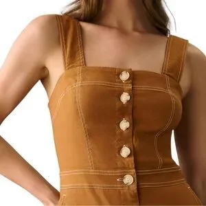 Finished with front button closure, front slant pockets, and back welt pockets, this jumpsuit offers both style and function. The warm bronze tone pairs beautifully with sandals, heels, or sneakers for versatile styling from spring through fall.
