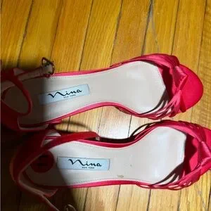 Beautiful Nina New York red satin strappy block heel sandals. Elegant and vibrant, these heels feature delicate satin straps and a comfortable block heel that makes them easier to walk in than traditional stilettos.
