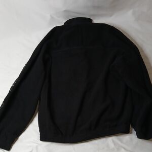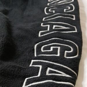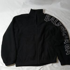 Black fleece jacket with full front zipper. Bold Balenciaga lettering along the sleeve. Zippered side pockets for convenience. High collar for extra coverage.