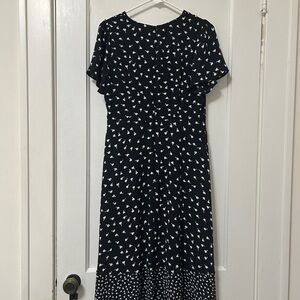 Talbots midi dress in a black base. V-neck with gentle gathers at the bodice. Short sleeves and a flowing skirt for easy wear. Feminine, versatile silhouette for day-to-night looks.