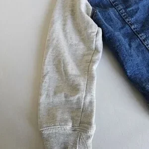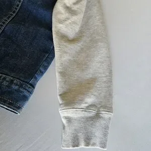 Stylish kids jean jacket with a soft hood and sleeves. Features a classic blue denim body with light gray sweatshirt-style hood and sleeves. Snap-button front and functional chest pockets for easy wear. Comfortable layered look perfect for everyday play.