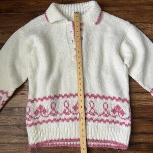 Adorable vintage handknit wool sweater white with pink detailing. Features a collar and quarter button. Excellent condition Fits small to medium #coquette #cottagecore #wool #boho #fairy