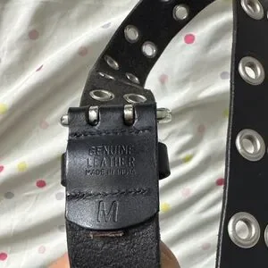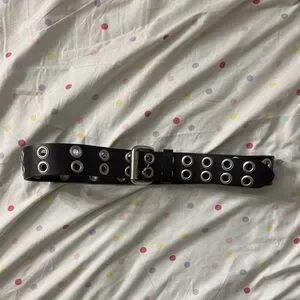 Elevate your style with this chic black double grommet belt. Perfect for adding an edgy touch to any outfit.