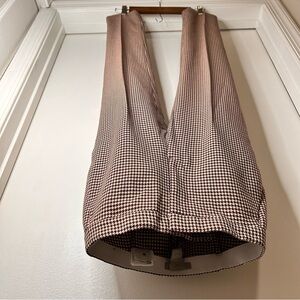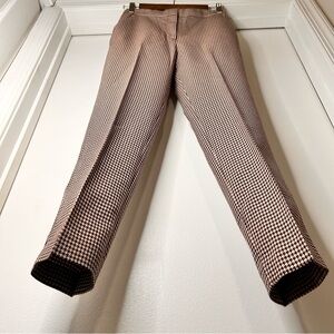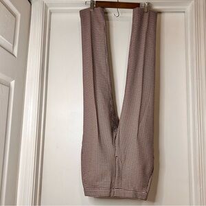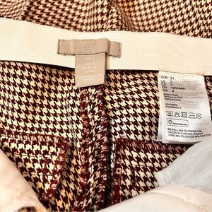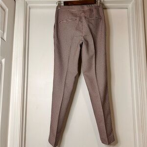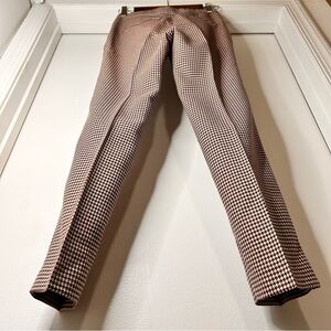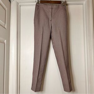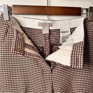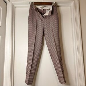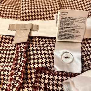 Tailored houndstooth pants in a rich burgundy, black, and cream pattern. Designed with a sleek, slim silhouette that creates a polished and flattering look. A classic statement piece that transitions effortlessly from office wear to chic everyday styling.