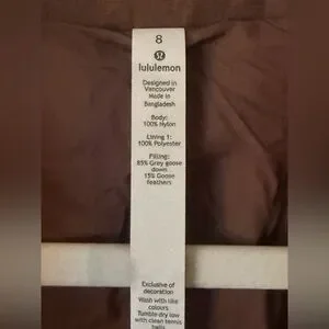 85% grey goose down / 15% feathers for warmth without bulk. Zip front with zip pockets and subtle Lululemon logo at back hem.