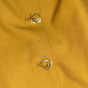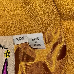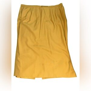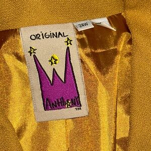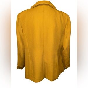Antthony blazer in a rich mustard-gold tone. Rounded collar with decorative pendant accent. Button-front closure with square buttons. Curved stitched paneling on front and sleeves. Relaxed tailored silhouette for layering. In good used condition with some staining as seen in photos. Jacket skirt suit combo. Necklace is used as a prop only and will not be included in listing. Measurements are Skirt length at 35 inches, waist at 22 inches. Jacket length 33 inches, pit to pit 27 inches, sleeve to pit 16 inches, shoulder to sleeve 24 inches.