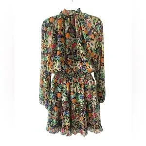 Lavender Brown Floral Mini Dress XS Black V Neck Tiered Long Sleeve