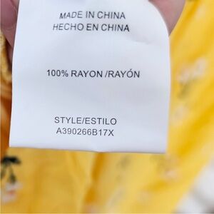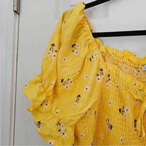 Cute yellow floral smocked baby doll dress. Lightweight fabric with puff sleeves and ruffle hem. Easy pull-on style for everyday wear.