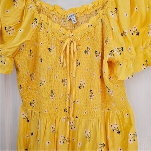 tags: floral dress, yellow dress, plus size dress, 2X dress, smocked dress, puff sleeve dress, casual midi dress, summer dress, garden party dress, sun dress, vacation, wedding guest, coastal cowgirl