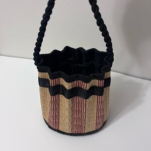 Stylish woven drawstring bucket bag in tan with black trim. Features a braided black shoulder strap and secure drawstring closure. Lightweight and versatile for everyday wear. Clean, modern look that complements casual outfits.