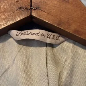Tailored in the USA with a hopsack-style weave. The interior is fully lined in tan fabric & multiple internal pockets. A single back vent. A staple for professional or semi-formal attire. Cleaning tag suggests wool blend.
