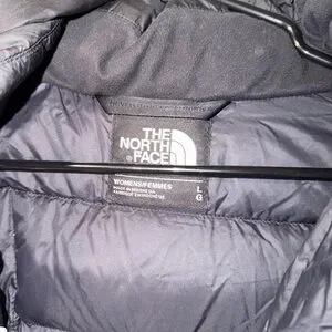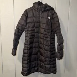 Long black puffer jacket by The North Face. Ideal for cold weather. Features a sleek design.