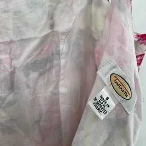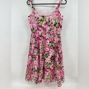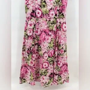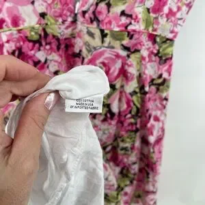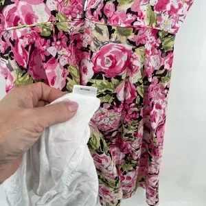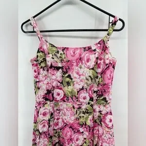 Talbots women’s pink floral dress with the green and black. 100% cotton imported fabric however, there is a flaw with the straps and they have been sewn on by hand. The previous owner cut them to make them fit her. Therefore this dress is priced to sell