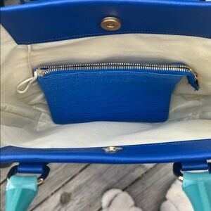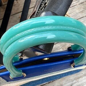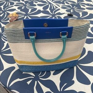 Stylish Furla tote with blue and yellow stripes. Features sturdy handles and spacious interior. Perfect for everyday use.