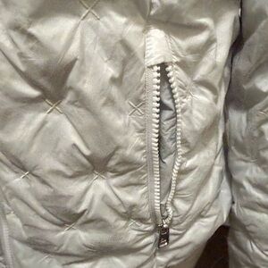 Chic and warm puffer jacket. Features quilted design. Ideal for cold weather. Almost perfect condition. Very small pin size dot on front by zipper that is not noticeable and a makeup spot on the inside front U can not see it because it is on the inside. Otherwise it is in perfect condition and is a lovely jacket! The last two pictures of are the mentioned imperfections. 19.5 pit to pit.