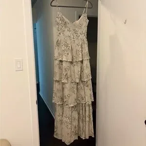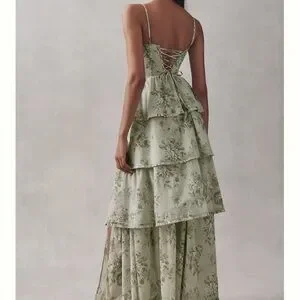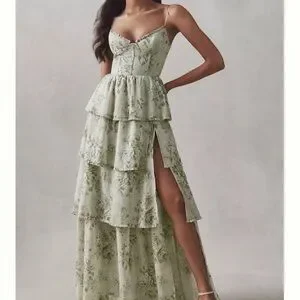Elegant maxi dress with floral pattern. Features tiered layers and a side slit. Perfect for special occasions.