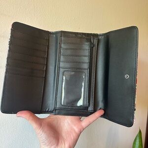 Trendy Ed Hardy long women's wallet with bold skeleton tattoo inspired print. 12 card slots, 2 clear card slots and inner zipper pocket. Measures 7 3/4 x 4 inches. Brand new with tags.