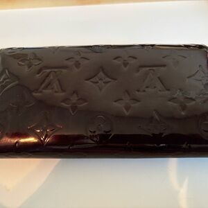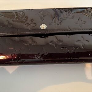 Add a touch of timeless luxury to your daily essentials with this stunning Louis Vuitton Sarah Wallet. Crafted from iconic Monogram Vernis patent leather, this piece features a deep, sophisticated burgundy-purple hue known as Amarante. Its glossy, embossed finish is both eye-catching and durable.