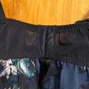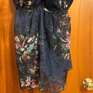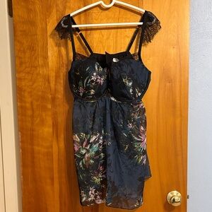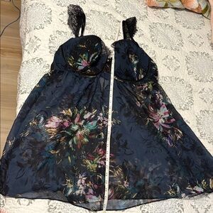 Elegant dress with floral patterns and lace trim. Features a fitted bodice and sheer overlay. New, no damage, it's just one piece, perfect for hot weather as it's very light, see photos