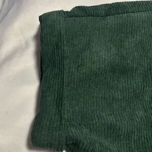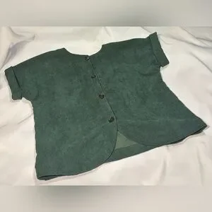 Relaxed V-neck women’s top in a textured dark green corduroy fabric. Features short rolled sleeves and a button-back detail for an elevated casual look. Soft drape and easy fit for everyday wear. Preowned from a smoke free home.