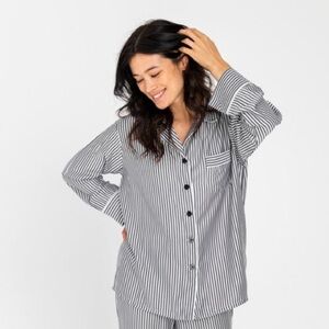Ultra soft Ettitude pajama set in classic charcoal & ivory pinstripe. Made from their signature CleanBamboo™ lyocell - breathable, temperature regulating, and insanely comfortable. Lovely piping and front pocket detail. Sleepwear with a relaxed, elevated fit.