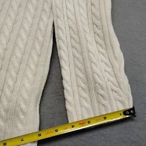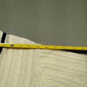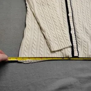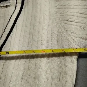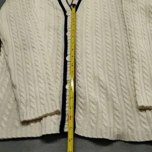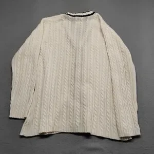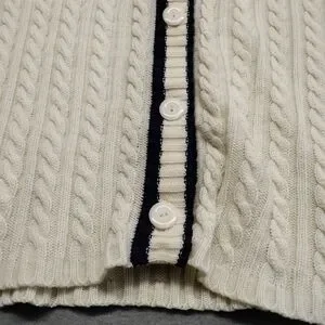 Stylish white cable knit cardigan featuring do blue trim. Perfect for layering.