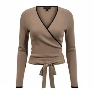 Elegant ribbed knit top by Laundry by Shelli Segal. Features a chic tan color and tie detail.